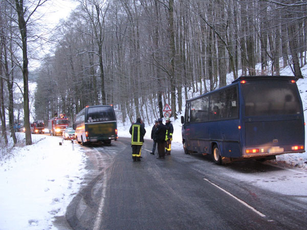 Einsatzbericht Ein Kleinbus mit 21 behinderten Kindern und deren Betreuern an Bord ist zwischen Arnsberg-Wennigloh und Hachen-Reigern auf abschüssiger schneeglatter Fahrbahn ins Rutschen gekommen und auf der Gegenfahrbahn nahe des Straßengrabens zum Stehen gekommen. Glücklicherweise wurde hierbei keiner der Insassen verletzt. Die 21 Kinder konnten ihre Fahrt noch vor dem Eintreffen der Feuerwehr mit 3 zum Unfallort beoderten Bullis fortsetzen. Die Polizei forderte im Wege der Amtshilfe die Feuerwehr zur Sicherung der Unfallstelle an. Daraufhin rückte der Stützpunkttrupp der Wache Neheim mit einem Löschfahrzeug und einer Drehleiter (Letztere zur Absicherung der Unfallstelle) zum Einsatzort aus. Nachdem klar war, dass niemand verletzt war, wurden von der Feuerwehr weitere Verkehrs-sicherungsmaßnahmen getroffen und das Eintreffen des Streudienstes abgewartet, welcher die Straße vom Eis befreite. Daraufhin konnten alle Fahrzeuge ihre Fahrt fortsetzen und die Straße wieder freigegeben werden. Der Leiter der Freiwilligen Feuerwehr der Stadt Arnsberg, Brandamtsrat Peter Glaremin, machte sich selbst ein Bild von den Arbeiten vor Ort.