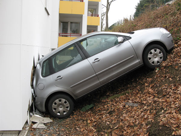 Einsatzbericht Ein führerloser PKW ist am Vormittag des 17. Dezember auf der Ehmenstraße in Arnsberg rückwärts von einer abschüssigen Garagenzufahrt gerollt und gegen die Fassade einer Seniorenwohnanlage geprallt. Auf seiner Odyssee hat das Fahrzeug die an die Garagenausfahrt grenzende Straße überquert, ist den gegenüberliegenden Bordstein hinaufgefahren, hat einen Metallzaun durchbrochen und ist eine Böschung hinuntergerollt. Am Fuße der Böschung stoppte dann die Hauswand der Seniorenwohnanlage die unkontrollierte Fahrt, so dass der PKW mit einer demolierten Heckpartie dort zum Stehen kam. Da zunächst nicht ausgeschlossen werden konnte, dass sich eingeklemmte Personen in demPKW befanden, kam die Feuerwehr zum Einsatz. Glücklicherweise stellte sich dies aber als nicht zutreffend heraus. Es wurde niemand verletzt. Da auch keine Betriebstoffe aus dem Fahrzeug ausliefen, beschränkte sich die Aufgabe der Feuerwehr somit auf die Sicherung des beschädigten Metallzauns an der Unfallstelle mittels Flatterband. Die Polizei regelte den Abtransport des havarierten Fahrzeugs.