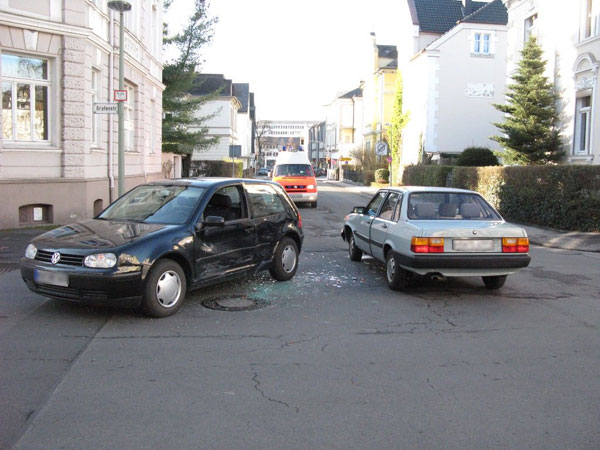 Einsatzbericht Auf der Kreuzung Grafenstraße / Zum Schützenhof in Arnsberg kam es am Freitag, den 28.11.2008 gegen 13:00 Uhr zu einem Zusammenstoß zweier PKW. Da zunächst gemeldet worden war, dass Personen in den Fahrzeugen eingeklemmt seien, rückte die Feuerwehr mit 2 Löschfahrzeugen zum Einsatzort aus. Sie musste vor Ort jedoch nicht mehr tätig werden, da sich die Insassen der verunfallten PKW bereits selbständig aus ihren Fahrzeugen befreit hatten. Zwei Personen wurden an der Unfallstelle vom Rettungsdienst versorgt. Eine Person wurde ins Krankenhaus transportiert. Die Polizei, die kurze Zeit später am Einsatzort eintraf, nahm den Unfall auf. Damit war der Einsatz für die Feuerwehr beendet.