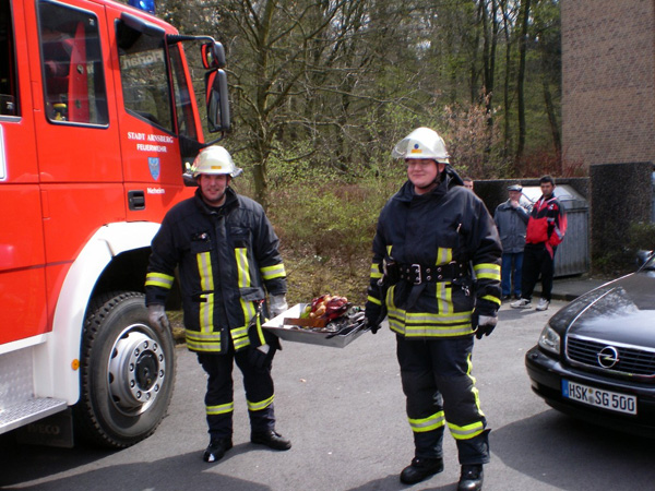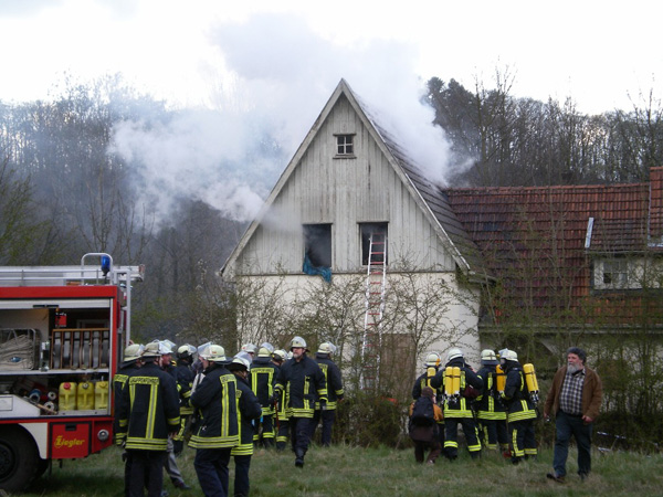 Einsatzbericht Gegen 17:55 wurde die Feuerwehr Arnsberg über Sirenenalarm zu einem Wohnhausbrand gerufen. Eine Anwohnerin hatte den Notruf gewählt. Beim Eintreffen der Einsatzkräfte stand der gesamte Dachstuhl in Flammen.Die Feuerwehr ging mit insgesamt vier Trupps vor, wobei sich drei Trupps unter Atemschutz auf den Innnenangriff konzentrierten. Die Meldung, daß sich möglicherweise noch Personen im Gebäude aufhalten könnten, hat sich nach intensiver Suche nicht bestätigt. Nachdem die ersten Flammen gelöscht waren, wurden die Dachziegel entfernt, um weitere Glutnester abzulöschen. Dies gelang nur durch die Vornahme von sogenannten Steckleitern. Die Drehleiter konnte nicht in Stellung gebracht werden, da das Gebäude zu weit von der Straße entfernt lag und keine Zwegung vorhanden war, die einen ausreichend festen Untergrund bot. Zur Brandursache und Schadenshöhe können noch keine Angaben gemacht werden. Die Kriminalpolizei hat ihre Arbeit aufgenommen. (18.04.2008) Arnsberg. Ursache des Brandes eines leerstehenden und baufälligen Hauses in der Lasmecke am Mittwochabend (die WR berichtete gestern) wurde durch Brandstiftung verursacht. Wie die Polizei gestern berichtete, ergaben sich für die ermittelnden Beamten schon während der Löscharbeiten Hinweise auf zwei Jugendliche. Eine Anwohnerin hatte erste Qualmwolken aus dem Haus bemerkt, sah gleichzeitig die aus dem Haus laufenden Jugendlichen und alarmierte die Feuerwehr. Noch während des Einsatzes kehrten die 15 und 16 Jahre alten Jungen mit ihren Müttern zum Brandort zurück und räumten ein, das Feuer verursacht zu haben. Sie hätten einen Silvesterknaller gezündet, der Altpapier entzündete und für den Hausbrand sorgte. Aus Panik seien sie dann weggelaufen. Der Schaden an dem seit acht Jahren unbewohnten und verfallenen Haus kann die Polizei nicht beziffern. Gegen die Jugendlichen wird nun wegen Brandstiftung ermittelt. (Foto und Text: WR)