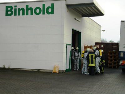 Einsatzbericht Eingeklemmte Person in Neheim Die Feuerwehr wurde heute Morgen um 8:41 Uhr zu einem Betriebsunfall gerufen. Ein Mitarbeiter war beim Abladen eines LKW`s mit einem Stapler umgekippt und wurde eingeklemmt. Der Verletzte wurde vom Notarzt versorgt und ins Krankenhaus transportiert. Aus dem Stapler (elektrisch betrieben) liefen ca. 70 Liter Betriebsstoffe wie Hydrauliköl und Batteriesäure (Schwefelsäure) aus. Die Mitarbeiter des Betriebesmussten die Halle verlassen, weil Säuredämpfe freigesetzt wurden. Die Feuerwehr setzte zwei Trupps unter Atemschutz ein, um die auslaufende Flüssigkeit mit Säurebindemittel abzustreuen. Ein Spezialunternehmen aus Iserlohn wurde mit der Entsorgung der freigesetzten Stoffe beauftragt.