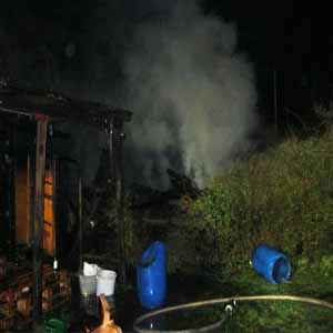 Einsatzbericht Rumbeck. Ein brennender Weideunterstand am Rumbecker Eisenhammer rief am Dienstagabend kurz nach 21 Uhr die Feuerwehr mit Sirenenalarm auf den Plan. Anfangs waren die Einsatzkräfte von einem Scheunenbrand ausgegangen. Als die Wehrmänner aus Rumbeck ankamen, stand der Holzbau mit dem Wellblechdach, der Pferden eines naheliegenden Gutshofes im Sommer als Unterstand dient, schon lichterloh in Flammen und stürzte kurz darauf ein. Von der Straße aus legten die Wehrmänner mehrere Schlauchleitungen über die ausgedehnte Wiese, trotzdem schnell Wasser am Brandgeschehen zur Verfügung stand, war der Unterstand nicht mehr zu retten.Der Eigentümer des Geländes war während der Löscharbeiten anwesend und zeigte sich sehr beunruhigt, denn es sei nicht der erste Fall von Vandalismus auf seinem Gelände, wie er unserer Zeitung vor Ort erzählte. Einige Tage vor Weihnachten waren unweit des jetzt abgebrannten Unterstandes 25 Siloballen von Unbekannten aufgeschlitzt worden, vor drei Wochen waren es 10 Ballen, die mit einem Messer zerstört wurden. Ein beträchtlicher finanzieller Schaden für den Besitzer, denn ein Ballen habe einen Wert von 40 Euro.Am Dienstagabend im Einsatz waren die Löschgruppe Rumbeck und die Löschzüge Oeventrop und Arnsberg sowie die beiden Hauptwachen und der Rettungsdienst.(Quelle: W. Becker, WESTFALENPOST)