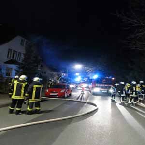 Um 01:51 Uhr wurden der Löschzug Arnsberg und die Löschgruppe Rumbeck über Sirenenalarm mit dem Stichwort "Brennt Zweifamilienhaus" nach Uentrop alarmiert. Zusätzlich alarmierte die Feuerwehr-Leitstelle in Meschede auf Grund der Notrufmeldung auch die Hauptwachen Arnsberg und Neheim, den Fernmeldedienst der Arnsberger Wehr sowie den Rettungsdienst. Zum Zeitpunkt des Eintreffens der ersten Rettungskräfte standen das erste Obergeschoss und der Dachstuhl des Wohnhauses bereits im Vollbrand. Umgehend bauten die Wehrleute Wasserversorgungen von mehreren Hydranten auf und trugen einen umfassenden Löschangriff von mehreren Seiten, unter anderem über eine Drehleiter, vor. Auf Grund der starken Rauchentwicklung mussten die Einsatztrupps hierbei teilweise unter schwerem Atemschutz vorgehen.