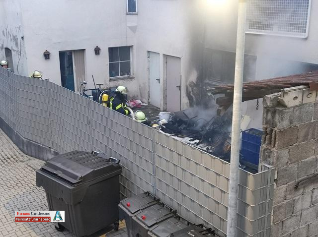 Bei eintreffen der ersten Feuerwehrkräfte brannte Unrat an der Gebäudefassade. Um in das Wohngebäude zu gelangen musste die Brandmeldeanlage des angrenzenden Gewerbeobjektes ausgelöst werden.