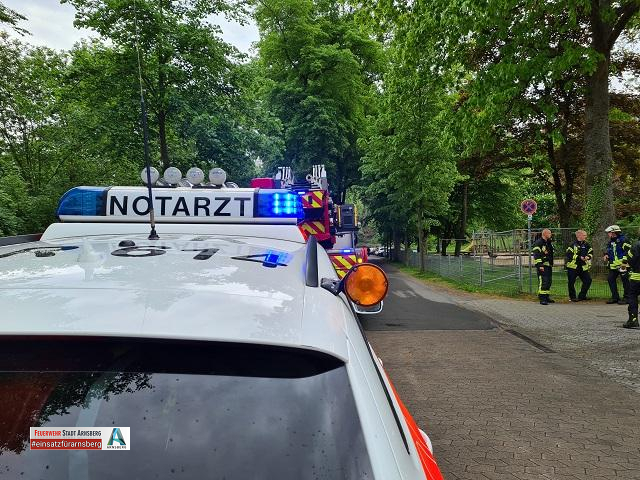 Arnsberg. Zur Mittagszeit erhielt die Feuerwehr die Alarmmeldung, dass eine Person im Eichholz den Berg heruntergestürzt sei. Von dem Sportplatz an der Promenade aus wurde die Lage erkundet, An der Festhalle wurde ein Bereitschaftsraum eingerichtet.