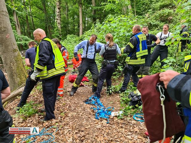 Die Feuerwehr und der Rettungsdienst versorgten die Person und retteten sie mit Hilfe einer Schleifkorbtrage. Aufgrund der Beschaffenheit des Geländes und der Zuwegung war es ein Material- und Personalaufwendiger Einsatz.