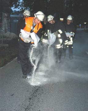 Gemeinschaftsarbeit Eine von ca. 15 Kilometer, vom Alten Feld in Arnsberg über den Ochsenkopf bis hin nach Sundern musste abgestreut werden. Mit einem Grossaufgebot der Feuerwehr wurde der Strassenverunreinigung zu Leibe gerückt. Die Arnsberger Kräfte arbeiteten in Richtung Sundern und die Sunderner Feuerwehr in Richtung Arnsberg. Der Verursacher konnte von der Polizei ermittelt werden. Einsatzleiter: BOI W. Karla Foto: W. Becker Einsatzdauer: 3 Stunden