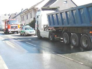 Kühlen angesagt Durch eine Qualmwolke an der Hinterachse dieser Zugmaschine wurde der Fahrer auf einen Schaden an der Bremse aufmerksam. Die sofort alarmierte Feuerwehr konnte die Bremsen kühlen und grösseren Schaden vermeiden. Einsatzleiter: HBM H. Wieneke Foto: Feuerwehr Einsatzdauer: 30 Minuten