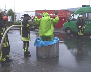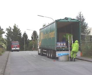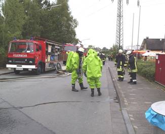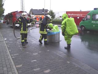 Chemikalienmix Aus ungeklärter Ursache war auf der Ladefläche eines holländischen LKW eine mit Chemikalien beladene Palette verrutscht. Hierbei war, „Gott sei Dank“, nur ein Behälter mit 25 Litern AMMONIUM-HYDROGEN-FLUORID-LÖSUNG leck geschlagen. Eine geringe Menge war ausgelaufen und hatte zwei weitere Behälter benetzt. Die Chemikalie ist ätzend und gesundheitsschädlich. Der LKW-Fahrer hatte selbst die Leistelle angerufen und mehrere UN-Nummern von der Ladung durchgegeben. Bei Eintreffen der Feuerwehr saß der Fahrer auf der Bordsteinkante und klagte über Übelkeit. Er wurde vom Rettungsdienst versorgt und ins Krankenhaus gebracht. Schnell unter Kontrolle Der defekte und die kontaminierten Behälter wurden unter Vollschutzkleidung geborgen und bis zum Abtransport in einem Auffangbehälter zwischengelagert. Eine Gefahr für die Bevölkerung bestand nicht, der LKW stand nicht in der Nähe eines Wohngebietes. Entsorgung Die Behälter wurden in Edelstahlfässer umgeladen und luftdicht verschlossen. Für den Abtransport und die Entsorgung der Behälter wurde ein Spezialunternehmen hinzugezogen. Einsatzleiter: BOI H. Schulte Fotos: Feuerwehr Einsatzdauer: 3,5 Stunden