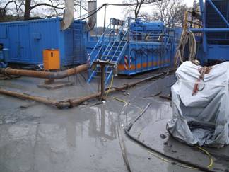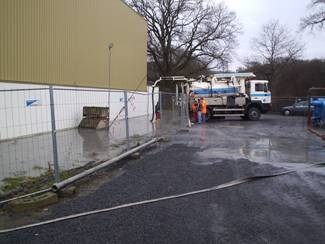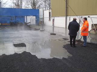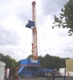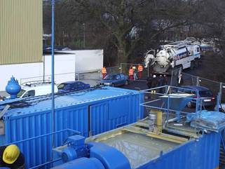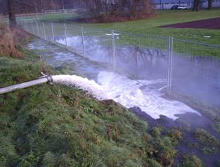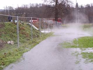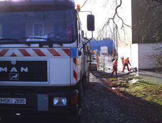 Grundwasserleiter angebohrt Beim der geothermischen Tiefenbohrung am Sportzentrum Große Wiese wurde in 583 Meter tiefe eine Grundwasserleiter abgebohrt. Nach Aussage der Fachfirma liegt die Chance auf Wasser zu Treffen bei unter 5 Prozent. Dichtungsmittel ausgespült Das Wasser schoss mit hohem Druck aus der Erde und schwemmte die Dichtmasse für das Bohrloch mit heraus. Schnell wurde das Baustellengelände von der Schlammmasse überschwemmt. Die angrenzende Sporthalle Große Wiese konnte größten Teils mit Sandsäcken geschützt werden. Wasser gebündelt Nach dem kein Dichtmittel mehr aus der Erde gedrückt wurde, konnten die Wassermassen unter Kontrolle gebracht werden. Das Wasser wurde über eine provisorische Rohrleitung abgeleitet, und einem Kanal zugeführt. Das warme und salzhaltige Wasser wird noch untersucht. Vielleicht ist ja eine Naturquelle angebohrt worden. Schlamm beseitigt Mit mehreren Saugwagen der Stadt Arnsberg und einer Spezialfirma wurden die Schlammmassen, übrigens nicht umweltschädlich, aufgenommen und an anderer Stelle verfüllt. Der Einsatz der Feuerwehr, die mit ca. 200 Sandsäcken angerückt war, war nicht mehr erforderlich. Internet Weiter Informationen über das Projekt „Geothermie“ und den Stand der Bohrarbeiten findet man im Internet unter: www.geothermie-arnsberg.de Einsatzleiter: BAR P. Glaremin Fotos: Feuerwehr Einsatzdauer: 2 Stunden