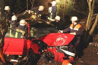 Schwer verletzt Ein PKW war aus noch ungeklärter Ursache nach rechts von der Fahrbahn abgekommen und eine Böschung hinabgestürzt. Beide Insassen klagten über Rückenschmerzen und konnten sich nicht selbst aus der misslichen Lage befreien. Um eine Patientenschonende Rettung zu gewährleisten, setzte die Feuerwehr hydraulisches Rettungsgerät ein. Einsatzleiter: BI D. Sölken Fotos: W. Becker Einsatzdauer: 2 Stunden