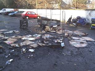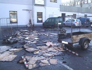 Umfeld gefährdet Aus bisher ungeklärter Ursache brannte in der Nacht ein mit Altpapier und Kartonagen beladener geschlossener Anhänger und zwei Rollcontainer. Der Anhänger stand direkt vor einer Hauswand. Die eingesetzten Kräfte zogen den Anhänger und die Rollis auf den freien Parkplatz. Unter Einsatz von Atemschutzgeräten konnte das Feuer dann schnell gelöscht werden. Hoher Schaden Erst am nächsten Morgen wurde das gesamte Ausmaß der Zerstörung sichtbar. Für den Anhänger und die Rollis heißt es Totalschaden. Die Hausfassade und ein neben dem Brandobjekt stehender PKW wurden stark beschädigt. Nach ersten Einschätzungen der Polizei beläuft sich der Schaden auf etwa 10 000 Euro. Einsatzleiter: BOI G. Knobloch Fotos: Feuerwehr Einsatzdauer: 30 Minuten