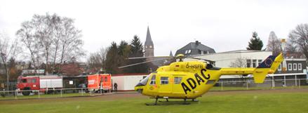 Sekundärtransport Bei Starts und Landungen von Hubschraubern wird durch die Feuerwehr der Brandschutz sichergestellt. Der Flug ging zur Barbara-Klinik in Hamm-Heessen. Hubschraubertransporte gelten als schneller und schonender als Transporte über die Strasse. Hier der Intensiv-Transport-Hubschrauber (ITH) Christoph Westfalen. Der Hubschrauber vom Typ Eurocopter BK 117 ist am Flughafen Münster-Osnabrück stationiert und fliegt für die ADAC Luftrettung GmbH. Einsatzleiter: OBM K. Stanke Foto: Feuerwehr Einsatzdauer: 1,5 Stunden