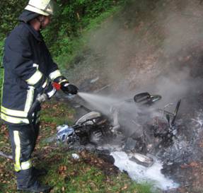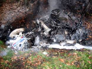 Schwer verletzt Ein Motorradfahrer einer vierköpfigen Gruppe war in einer Rechtskurve in den Gegenverkehr gerutscht. Der Biker wurde bei dem Aufprall schwer verletzt, das Motorrad schleuderte in eine Böschung und ging in Flammen auf. Ausgebrannt Die Versorgung des verletzten Motorradfahrers erfolgte durch die Notarztwagenbesatzung. Auch der schnelle Einsatz der Feuerwehr konnte nicht verhindern, dass das Motorrad vollständig ausbrannte. Einsatzleiter: BOI W. Karla Fotos: W. Becker Einsatzdauer: 1 Stunde