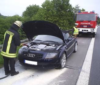 Feuerlöscher dabei Aus ungeklärter Ursache war Öl aus dem Motor eines Audi TT ausgetreten und in Brand geraten. Glücklicherweise hatte der Fahrer einen Feuerlöscher dabei und konnte die Flammen vor dem Eintreffen der Feuerwehr niederschlagen. Die Einsatzkräfte konnten die restlichen Glutnester schnell löschen und das ausgetretene Öl binden. Durch den Einsatz des mitgeführten Feuerlöschers, hielt sich der Schaden in Grenzen. Einsatzleiter: HBM U. Sodenkamp Fotos: Feuerwehr Einsatzdauer: 1 Stunde