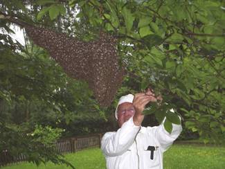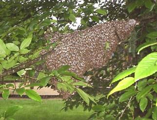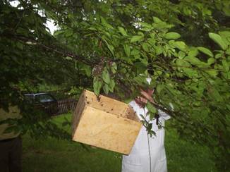 Grosses Bienenvolk Auf einem Wasser-Kinderspielplatz hatte sich in ca. zwei Meter Höhe ein Bienenschwarm niedergelassen. Um das Volk in behutsame Hände zu geben, wurde der frühere Löschgruppenführer von Breitenbruch und passionierte Imker Willy Schüttler um Hilfe gebeten. Gut gezielt Durch einen gezielten Schlag auf den Ast, an dem sich die kleinen Tierchen versammelt hatten, vielen alle in eine mitgebrachte Holzkiste. Die restlichen Bienen, die sich an die Imker- und Feuerwehruniform geklettet hatten, wurden abgeschüttelt. Bienen sind Nutztiere und stechen so schnell nicht. Günstige Wetterlage Der kurz zuvor eingesetzte Regen begünstigte die Bienenumsetzung. Denn bei Regen haften die Bienen eng zusammen und werden träge. Der Nachteil des Regens war, dass die Lagebesprechung mit Imker, Polizei und Feuerwehr auf der Ladefläche des Feuerwehrtransporters stattfinden musste. Einsatzleiter: BOI St. Knobloch Fotos: Feuerwehr Einsatzdauer: 1 Stunde