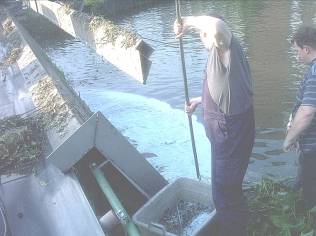 Feuerwehr reinigt Obergraben! Sonntag Spätnachmittag, die Feuerwehr reinigt einen Obergraben einer Chemiefirma. Weißes Pulver schwamm auf der Wasseroberfläche. Ein schlechter Scherz! Jemand hatte Ölbindemittel aus einem Lagerhäuschen des Ruhrverbandes entwendet und am Anfang des Obergraben (vor der Chemiefirma) auf dem Wasser verteilt. Vor einem Wehr der Chemiefirma wurde das Bindemittel aufgefangen, abgeschöpft und entsorgt.