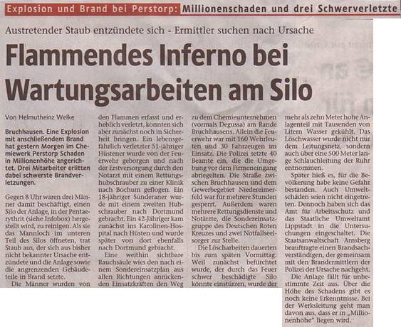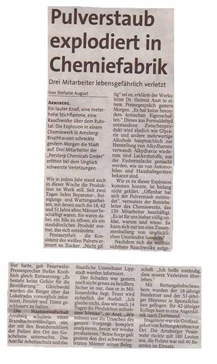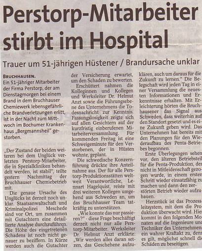 Ein ausführlicher Bericht kann erst nach Beendigung der Ermittlungsarbeiten erstellt werden. Einsatzleiter: BAR P. Glaremin Fotos: Feuerwehr Einsatzdauer: 24 Stunden Perstorp Privat Presse