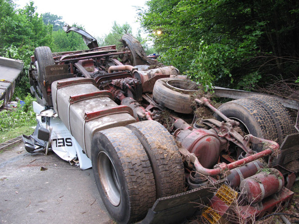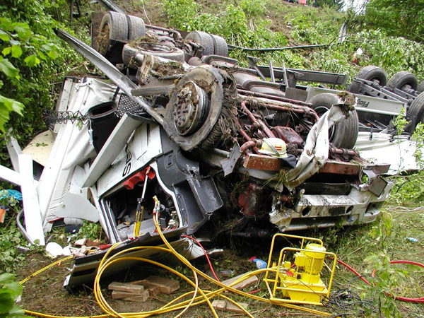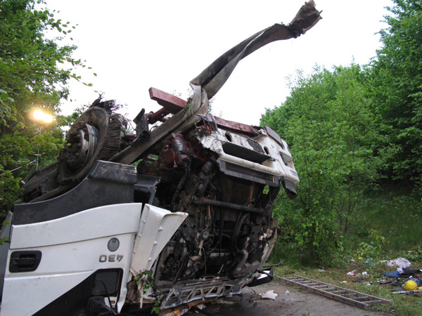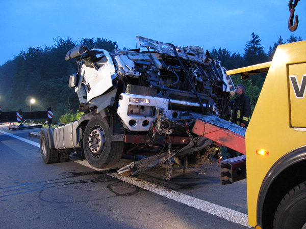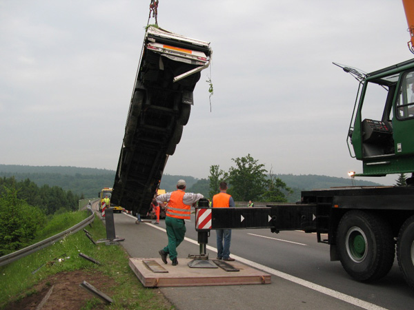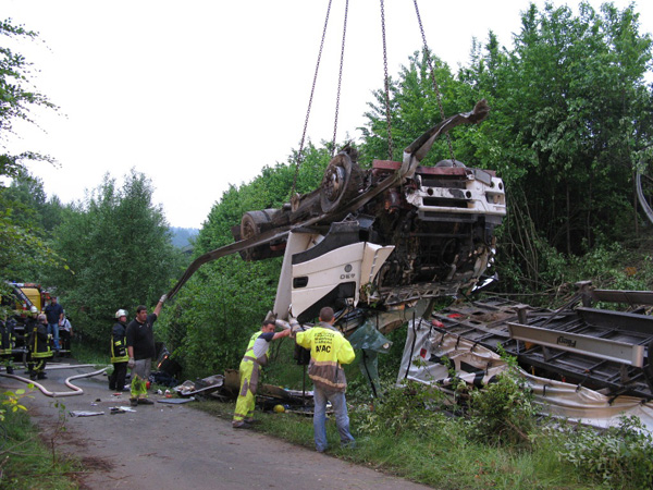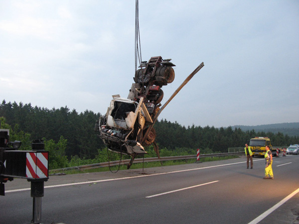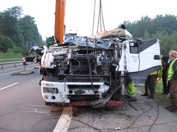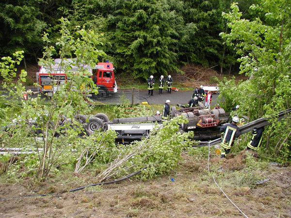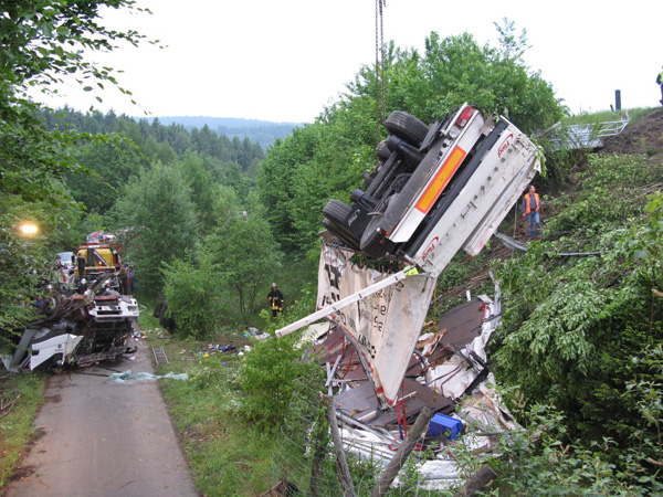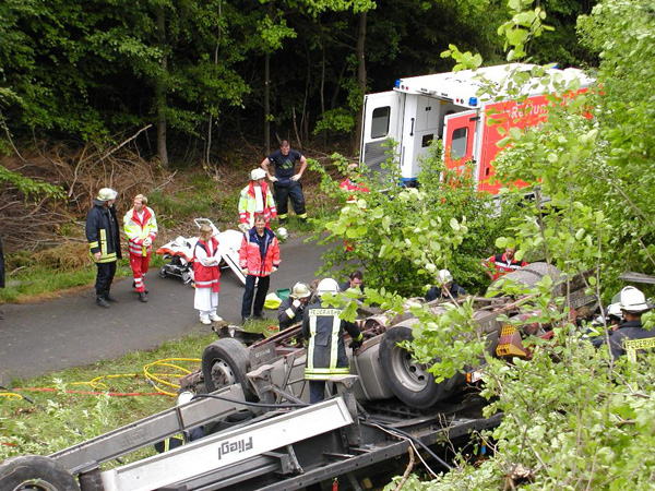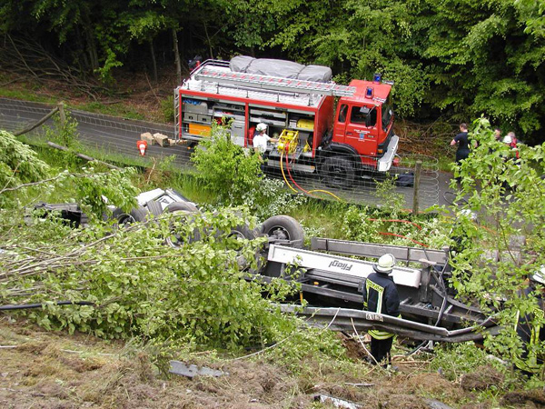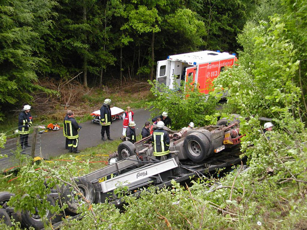 Der Fahrer eines mit Stahlplatten beladenen Sattelzuges verlor am Nachmittag auf der Bundesautobahn 46 kurz vor der Ausfahrt Arnsberg-Altstadt die Kontrolle über sein Fahrzeug, durchbrach die Mittelleitplanke, kreuzte die Gegenfahrbahn und stürzte eine mehrere Meter tiefe Böschung hinunter. Hierbei stürzte der Sattelzug um und blieb schwer beschädigt auf dem Dach liegen. Der Fahrer wurde in der völlig demolierten Fahrerkabine eingeklemmt und musste von den Feuerwehren aus Niedereimer, Arnsberg, Breitenbruchsowie dem Stützpunkttrupp aus seiner Notlage befreit werden. Er wurde von einem Rettungshubschrauber ins Krankenhaus nach Dortmund geflogen. Zur Bergung des havarierten Fahrzeugs wurde die Autobahn ab 19:00 Uhr in Fahrtrichtung Werl für ca. 4 Stunden voll gesperrt. Der Sattelzug wurde mit einem 200-Tonnen-Kran zurück auf die Fahrbahn gehoben und abtransportiert. Während der Bergungsarbeiten übernahm die Elektrofachgruppe der Freiwilligen Feuerwehr der Stadt Arnsberg die Ausleuchtung der Unfallstelle. Kameraden der Stadtteileinheit Arnsberg stellten den Brandschutz sicher und nahmen diebei der Bergung der Zugmaschine nochauslaufenden Betriebsstoffe auf.Die Bergung des Gespanns war gegen 22:00 Uhr beendet. Über die Schadenshöhe können noch keine Angaben gemacht werden.