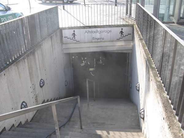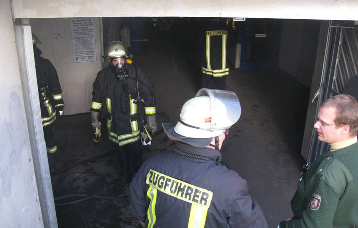 Im Bereich der Entlüftung der Herren-Toilette in der Tiefgarage am Neumarkt in Arnsberg ist am Samstag vormittag aus noch ungeklärter Ursache ein Brand ausgebrochen, das zu einer Verrauchung sowohl der betroffenen als auch der angrenzenden Toiletten sowie des am Steinweg gelegenen Eingangsbereiches der Tiefgarage geführt hat. Ein Polizei- beamter, der sein Fahrzeug in der Tiefgarage geparkt hat, hatte den Brand bemerkt und über seine Kollegen in der Polizeiwache Hüsten die Feuerwehr alarmiert. Die rückte in Form des Stützpunkttrupps der Wache Neheim und der Stadtteileinheit Arnsberg mit 4 Fahrzeugen an. Durch die Vornahme des Schnellangriffs-Rohres durch einen Trupp unter Atemschutz wurde der Brand schnell gelöscht. Die 15 Einsatzkräfte befreiten die Toiletten und den Eingangsbereich der Tiefgarage mit einem Hochleistungslüfter vom Brandrauch und übergaben die Einsatzstelle nach einer nochmaligen Kontrolle des Brandorts mittels Wärmebildkamera und Infrarot-Thermometer an den ebenfalls angeforderten Bereitschaftsdienst der Stadt Arnsberg. Über die Höhe des entstandenen Sachschadens lagen zum Einsatzzeitpunkt noch keine Erkenntnisse vor.