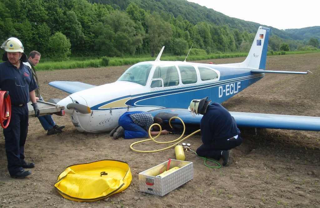Die Kameraden des Stützpunkttrupps von der Feuerwache in Neheim hatten am Donnerstag vormittag einen Spezialauftrag zu erledigen: Sie unterstützten ein Unternehmen aus Höxter bei der Bergung des Kleinflugzeugs eines italienischen Geschäftsmanns, welches gestern auf den Ruhrwiesen in Neheim nahe des Rolandsbogens wegen eines Motorenausfalls notgelandet werden musste. Der Pilot war bei dieser Havarie glücklicherweise nicht verletzt worden (die örtliche Presse berichtete). Um die Maschine für den Abtransport von diesem unvorhergesehenen Landeplatz vorzubereiten, hoben die 6 Einsatzkräfte das Flugzeug zunächst unter den Tragflächen mit Lufthebekissen an, um den Bug der Maschine auf ein Rollbrett zu bugsieren, welches an der Ladekante eines Transportanhängers des Bergungsunternehmens positioniert war. Mit vereinten Kräften wurde das Flugzeug dann komplett auf den Anhänger geschoben und dort für den Transport fixiert. Nach knapp 2 Stunden war dieser nicht alltägliche Einsatz beendet und das Flugzeug auf dem Weg in die Werkstatt.