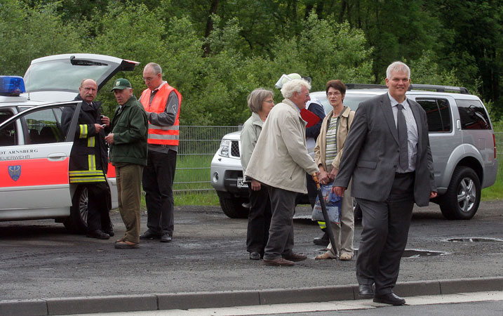 Die am 14.05.2009 im Zuge von Kanalbauarbeiten in der Arnsberger Tiergartenstraße entdeckte 250 kg-Fliegerbombe aus dem 2. Weltkrieg wurde am Freitag vormittag durch den Kampfmittelbeseitigungsdienst der Bezirksregierung Arnsberg entschärft und geräumt. Hierfür mussten von insgesamt 35 Einsatzkräften des Stützpunkttrupps von der Wache Neheim, der Einheit Arnsberg, des Arnsberger Rettungsdienstes, der SEG Arnsberg des Malteser Hilfsdienstes und der Polizei in Absprache mit der örtlichen Ordnungsbehörde die Straßen Unterm Römberge, Tiergartenstraße, Pirschweg und Arnsberger Burgweg evakuiert werden. Insgesamt wurden rund 180 Personen in Sicherheit gebracht. 2 bettlägerige Anwohner wurden für die Dauer der Entschärfungs- und Räumungsarbeiten unter ärztlicher Betreuung in die Unterkunft des Malteser Hilfsdienstes an der Arnsberger Ruhrstraße gebracht. Arnsbergs Bürgermeister Hans-Josef Vogel machte sich vor Ort selbst ein Bild von den Sicherungsarbeiten. Die Bombenentschärfung, die ohne Zwischenfälle verlief, konnte gegen 13:00 Uhr erfolgreich abgeschlossen werden. Danach konnten die Anwohner der evakuierten Straßenzüge wieder in ihre Wohnungen zurückkehren. (Fotos: Ted Jones, Westfalenpost / Text: Pressesprecher FF Stadt Arnsberg)