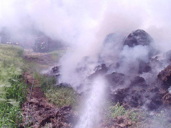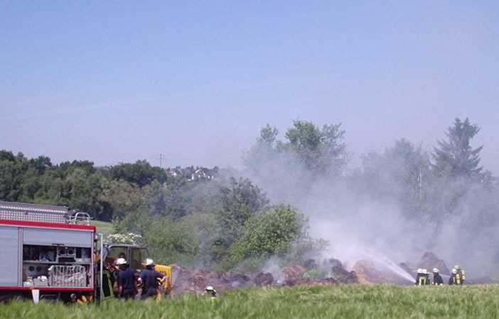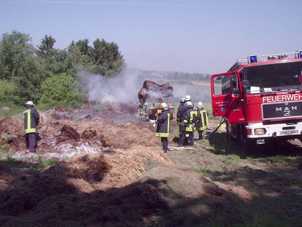Auf einem Feld brannten ca. 300 cbm Silageballen. Die Ballen wurden mit einem Radlader auseinandergezogen und mit drei Strahlrohren abgelöscht. Die Wasserversorgung wurde mit Tanklöschfahrzeugen im Pendelverkehr sichergestellt. Im Einsatz: Stützpunkttrupp, Stadtteileinheiten Voßwinkel, Bachum und Neheim mit fünf Löschfahrzeugen und 30 Einsatzkräften. Einsatzleiter: stellv. Kreisbrandmeister Werner Franke aus Bachum. Dies war der zweite Feuerwehreinsatz an diesem Tag in Arnsberg-Voßwinkel: Am Morgen brannte an der Echthausener Straße ein Traktor, der vom Besitzer selbst gelöscht wurde.