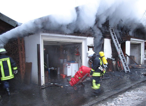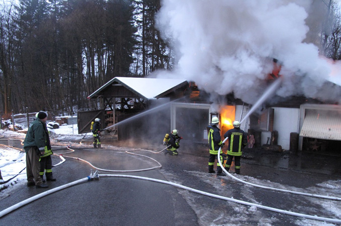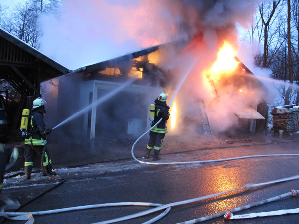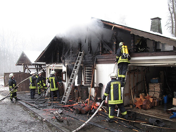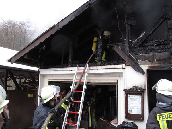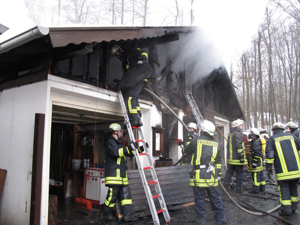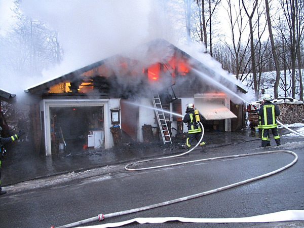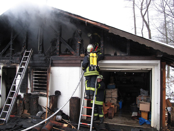 Sirenenalarm für die Arnsberger Feuerwehr am Sonntag morgen (17.01.2010) um 07:55 Uhr: Die Blauröcke wurden zu einem gemeldeten Hüttenbrand am Arnsberger Waldfriedhof alarmiert. Beim Eintreffen der ersten Kräfte stellte sich heraus, dass der Stützpunkt des städtischen Arnsberger Forstbetriebs bereits in voller Ausdehnung brannte. Ein angrenzender noch nicht vom Brand betroffener Carport mit einem dort untergestellten Bulli konnte von den insgesamt rund 40 vor Ort befindlichen Einsatzkräften aus Arnsberg und vom Stützpunkttrupp der Wache Neheim durch den schnellen Einsatz mehrerer Trupps mit einem gezielten Löschangriff geschützt werden. Die Werkstatt und das Lager der Forstleute waren jedoch nicht mehr zu retten, zu weit war der Brand bereits fortgeschritten. Insgesamt bekämpften 5 Trupps, davon einer unter Atemschutz, die Flammen, wobei für die Wehrleute eine besondere Gefahr von den in dem Gebäude gelagerten Betriebsstoffen für die Forstgeräte und anderen Gefahrstoffen ausging. Nachdem der massive Löschangriff, der von Tankfahrzeugen und zusätzlich von einem Hydranten an der Sunderner Straße aus gespeist wurde, Erfolg zeigte, wurden die verbliebenen Gefahrstoffe aus einer Garage geborgen und die restlichen Brandnester mit Hilfe einer Wärmebildkamera lokalisiert und abgelöscht. Der Winterdienst der Stadt sicherte die Einsatzstelle gegen gefrierendes Löschwasser durch den Einsatz von Streusalz, und die Stadtwerke entsandten einen Mitarbeiter, um die beschädigte Wasserleitung zu dem Brandobjekt abzuschiebern. Die vor Ort befindliche Polizei hat die Ermittlungen zur Brandursache aufgenommen. Über die Schadenshöhe konnten zum Einsatzzeitpunkt noch keine Angaben gemacht werden.