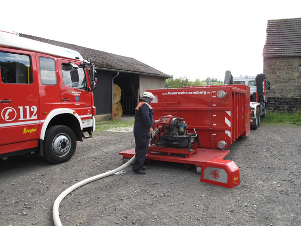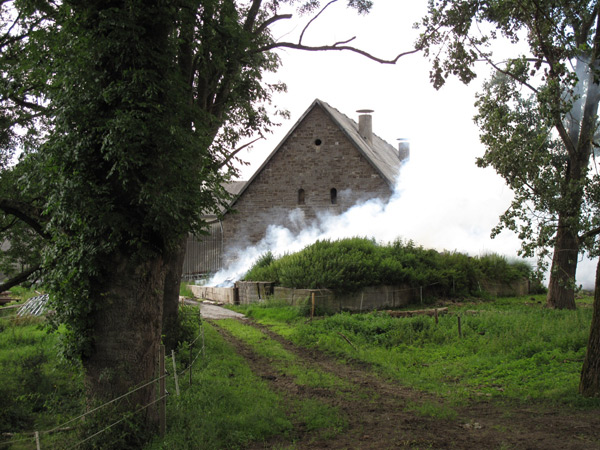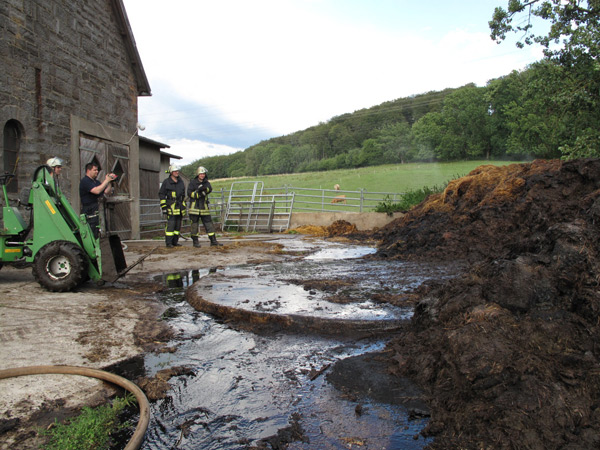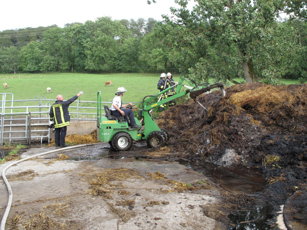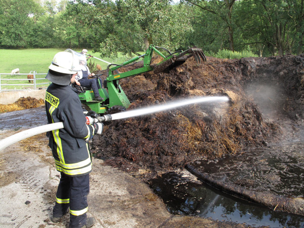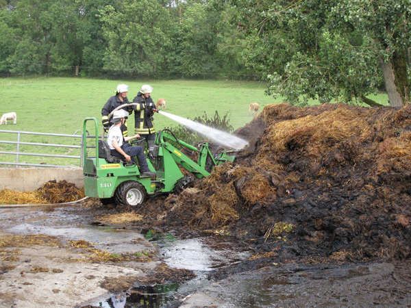 Brandeinsatz Wennigloh. Zu einem nicht alltäglichen Einsatz rückten die Feuerwehren aus Wennigloh, Müschede und Arnsberg sowie die Hauptwache der Feuerwehr der Stadt Arnsberg am Samstag, den 09. Juli um 17:00 Uhr nach Wennigloh-Bönkhausen aus. Eine etwa sechs mal sechs Meter große neben einem Stallgebäude gelegene Mistmiete eines landwirtschaftlichen Anwesens war aus bislang ungeklärter Ursache in Brand geraten. Die erhebliche Rauchentwicklung war über mehrere hundert Meter deutlich sichtbar. Die Einsatzkräfte aus Wennigloh, Müschede und von der Hauptwache bekämpften den Brand zunächst mit dem Wasser aus den Tanks der Löschfahrzeuge und aus einem Hydranten. Da jedoch das Wasserleitungsnetz in diesem Teil Wenniglohs für die Bekämpfung dieses Brandes nicht ausreichte, wurde das Wechselladerfahrzeug aus Arnsberg mit dem Abrollbehälter Wasser, der 10.000 Liter Löschwasser mitführt, zur Einsatzstelle beordert. Um die Löschwirkung noch zu erhöhen, wurde dem Wasser ein sogenanntes Netzmittel beigemengt, was das Löschmittel noch tiefer in den Misthaufen einsickern ließ. Außerdem wurden Teile der Miete mit dem zur Verfügung gestellten Schlepper eines benachbarten Landwirts abgetragen, um besser an die tiefer gelegenen Glutnester zu gelangen. Mit Hilfe einer Wärmebildkamera und eines Fernthermometers wurde das Brandgut außerdem auf weitere Glutnester kontrolliert. Nach rund zwei Stunden war der Einsatz auch für die letzten an der Einsatzstelle verbliebenen Kräfte der Feuerwehr, die mit 8 Fahrzeugen und rund 25 Einsatzkräften vor Ort war, beendet. asd