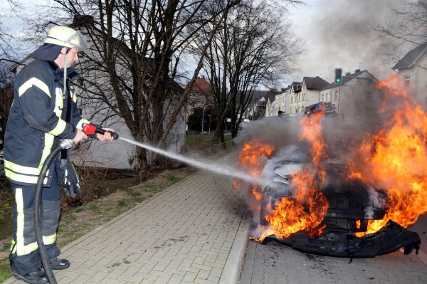 Arnsberg. In hellen Flammen stand am Montag, 03. März, dieser PKW auf der Ringstraße unweit der Kreuzung zur Rumbecker Straße. Als die Männer der Hauptwache und des Löschzuges Arnsberg am Einsatzort eintrafen, brannte das Auto bereits in voller Ausdehnung. Das Feuer war schnell gelöscht, zur Brandursache konnten noch keine Angaben gemacht werden. Der Straßenabschnitt war während der Löscharbeiten von der Polizei gesperrt.