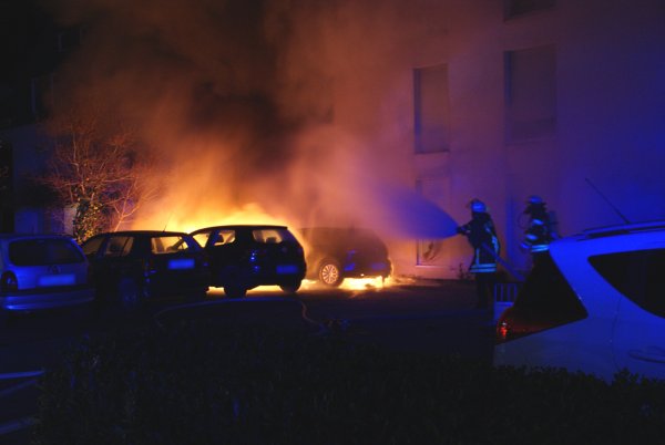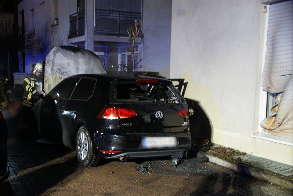 Beim Eintreffen der Einsatzkräfte stand der PKW bereits in Vollbrand. Unter schwerem Atemschutz konnte der Brand mit mehreren Strahlrohren schnell gelöscht werden. Ein nebenstehender PKW sowie der Rollladen-Kasten eines angrenzenden Wohnhauses wurden durch die starke Wärmestrahlung ebenfalls beschädigt. Die Feuerwehr kontrollierte das Gebäude auf etwaige Glutnester.