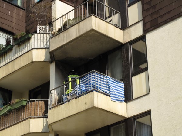 Die anwesende Wohnungsinhaberin reagierte geistesgegenwärtig, in dem sie sofort die Balkontür schloss und schützte dadurch ihre Wohnung. Das Glas der Balkontür konnte der großen Wärme des durch die Gasflamme entstandenen Brandes jedoch nach einiger Zeit nicht mehr standhalten und barst. Daraufhin wurde auch das Wohnungsinnere durch die Rauchentwicklung in Mitleidenschaft gezogen.
