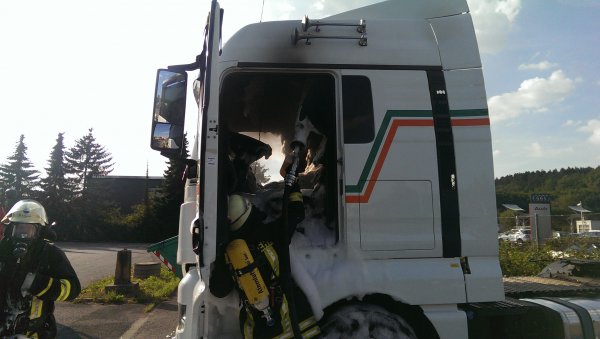 Beim Eintreffen der ersten Einsatzkräfte drang bereits dichter schwarzer Brandrauch aus der Fahrerkabine des LKW. Sofort gingen zwei Einsatztrupps unter Umluft unabhängigem Atemschutz zur Brandbekämpfung vor und löschten das Feuer nach kurzer Zeit mit einem Schaum-Schnellangriffsrohr. Nach dem Löschen des Brandes wurde die Kabine noch nach weiteren möglichen Glutnestern abgesucht.