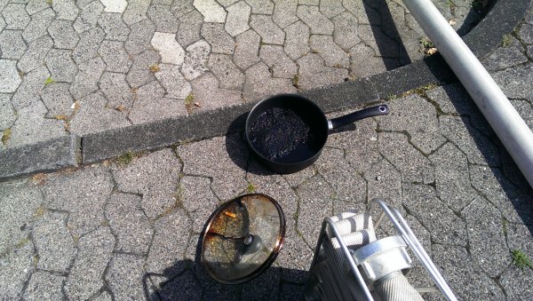 Beim Eintreffen der Feuerwehr machte sich umgehend ein Trupp unter Umluft unabhängigem Atemschutz auf, um den Brandherd zu lokalisieren Während dessen begleiteten die übrigen Einsatzkräfte die Bewohner des Hauses ins Freie. Schnell konnte der Brandherd gefunden werden, bei dem es sich um angebranntes Essen in einer Wohnung im dritten Obergeschoss handelte. Die verkohlten Überreste des Mittagsmahls wurden ins Freie gebracht und dort abgelöscht. Bevor alle Bewohner wieder in ihre Wohnungen zurückkehren konnten, wurde das Gebäude noch mit einem Hochleistungslüfter gelüftet.