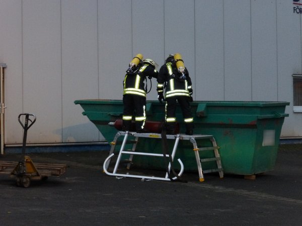 Die angeforderten Spezialkräfte der Feuerwehr nahmen nach ihrem Eintreffen Messungen hinsichtlich einer Explosionsgefahr vor und sperrten den Gefahrenbereich ab. Nachdem die Wehrleute die Kühlung der Flasche einige Zeit lang fortgesetzt hatten, wurde ein in der Nähe befindlicher Container mit Wasser gefüllt und die Acetylen-Flasche unter ständiger Kontrolle ihrer Temperatur in das kühle Wasserbad verbracht. Anschließend wurde der Container auf einem anliegenden Platz in sicherer Entfernung deponiert und dort gesichert. Das betroffene Unternehmen bestellte eine Entsorgungs-Firma zum späteren Abtransport der Acetylen-Flasche.