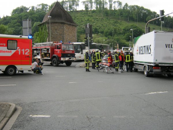 Arnsberg. Am Mittag des 19. Juni wurde gegen 12:30 Uhr die Hauptwache Arnsberg zur Beseitigung einer Ölspur alarmiert. Diese war durch einen Verkehrsunfall auf der Jägerstraße am westlichen Portal des Arnsberger Altstadttunnels entstanden, nachdem dort ein LKW und ein PKW kollidiert waren.