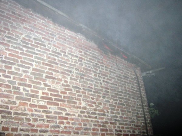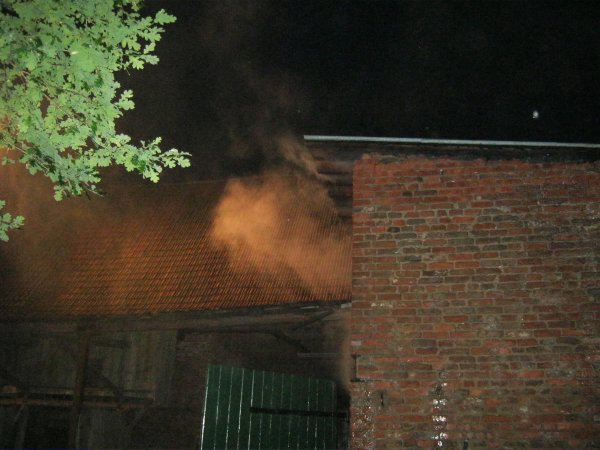 Beim Eintreffen der ersten Einsatzkräfte konnten diese einen leichten Feuerschein in dem hinteren Teil einer nahe eines Wohnhauses gelegenen Scheune feststellen. Sofort wurde eine Schlauchleitung vom Löschwassertank eines Feuerwehr-Fahrzeugs zur Einsatzstelle verlegt, um das Feuer von außen zu bekämpfen. Zeitgleich wurde eine weitere Löchwasserversorgung aus einem Unterflurhydranten aufgebaut, und mehrere Einsatztrupps nahmen unter schwerem Atemschutz einen Löschangriff von innen vor.