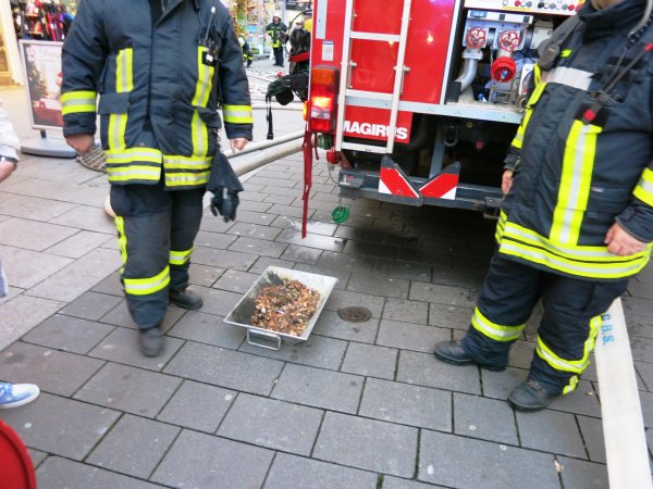 Der Trupp entfernte das Laub mit einer so genannten Schuttmulde aus dem Lichtschacht und löschte es im Freien ab. Anschließend wurde der Heizungskeller ausgiebig gelüftet und mit einer Wärmebildkamera auf verbliebene Glutnester kontrolliert. Für die Einsatzdauer wurde die Einsatzstelle in der belebten Fußgängerzone weiträumig durch die Feuerwehr abgesperrt. Da zu keiner Zeit eine Gefährdung im Verkaufsbereich des betroffenen Geschäftshauses bestand, war eine Evakuierung des Gebäudes nicht notwendig.