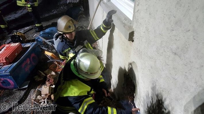 Mit schwerem Werkzeug - Bohrhammer und Stemmwerkzeug - verschafften sich die ersten Kräfte an der Einsatzstelle zunächst einen Überblick über das Ausmaß des Brandes in der Außenfassade. Weil zu diesem Zeitpunkt noch nicht klar war, wie weit das Feuer schon in das Mauerwerk vorgedrungen war, wurden weitere Kräfte der Feuerwehr nachalarmiert. Damit waren in der ersten Phase des Einsatzes rund 35 Feuerwehrleute mit drei Fahrzeugen und einer Drehleiter im Einsatz.