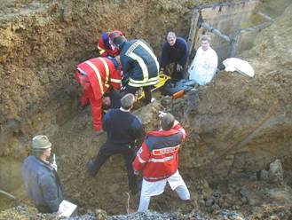 Arbeiter verletzt: Bei Kanalbauarbeiten in ca. drei Meter Tiefe wurden Verbauelemente eingebaut. Durch eine einstürzende Grabenwand wurde ein Arbeiter mit dem Unterkörper verschüttet und brach sich dabei ein Bein. Zum Transport des Verletzten aus der Baugrube wurde der Stützpunkttrupp der Arnsberger Feuerwehr zur Hilfe gerufen. Nach der Versorgung durch den Notarzt wurde der Verletzte unter zur Hilfenahme einer Schaufeltrage aus der Grube in das nahe gelegene Krankenhaus gebracht. Der Unfall ereignete sich auf der Erweiterungsbaustelle des Karolinen-Hospital in Arnsberg-Hüsten. Die optimale Versorgung des Verletzten konnte durch einen anwesenden Arzt aus dem Karolinen-Hospital Hüsten, dem Notarzt aus dem Johannes-Hospital Neheim und dem Rettungsdienst der Fa. Hagelstein sichergestellt werden. Die eingesetzte Drehleiter, kam auf Grund der zu weiten Entfernung der Baugrube von der Strasse, nicht zum Einsatz.