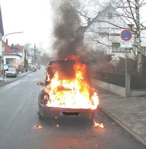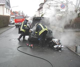 Fahrzeugbrand im Kofferraum: Der Fahrer dieses Opel Omega bemerkte bei einem Wendmanöver Rauch am Heck des PKW. Nach dem Öffnen des Kofferraumdeckels schlugen Flammen heraus. Durch zahlreiche Prospekte, Kataloge und Ordnern, die sich im Kofferraum befanden, hatte das Feuer genügend Nahrung und griff auf den hinteren Teil des Fahrgastraumes über. Auch die sofort alarmierte Feuerwehr, Anfahrt unter zwei Minuten, konnte einen Totalschaden des PKW nicht verhindern. Das Feuer wurde zügig mit dem Schnellangriff unter Kontrolle gebracht. Die Brandursache ist unklar.