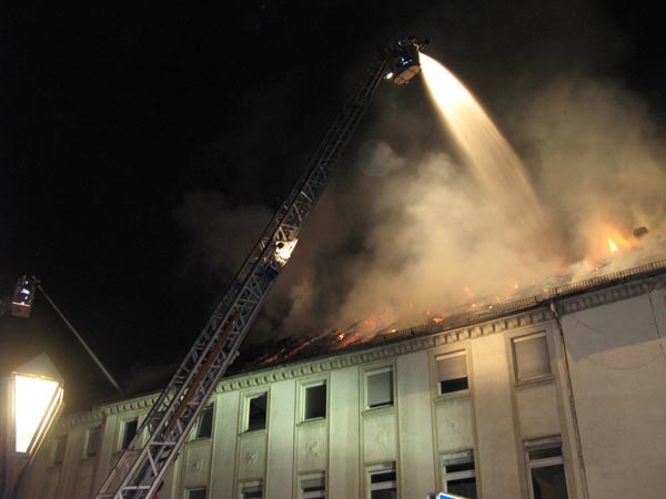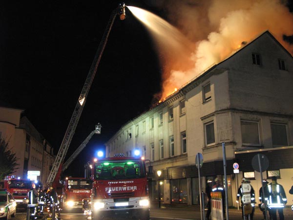 Dachstuhlbrand in der Bömerstraße In der Arnsberger Bömerstraße ist in der Nacht von Freitag, den 01. auf Samstag, den 02. August im Dachstuhl eines leerstehenden mehrgeschossigen Wohnhauses ein Brand ausgebrochen, der sich kurz nach Eintreffen der ersten Feuerwehrkräfte durch die Dachhaut fraß. Die zunächst bestehende Vermutung einer im Gebäude vermissten Person erwies sich im Verlauf der Löscharbeiten zum Glück als nicht zutreffend. Die insgesamt über 120 Einsatzkräfte aus 6 Stadtteilen sowie vom Stützpunkttrupp, dem Fernmeldedienst und dem Rettungsdienst bekämpften den Brand sowohl mit zahlreichen Trupps unter Atemschutz im Innenangriff als auch über 2 Drehleitern im Außenangriff. Die innen eingesetzten Trupps mussten auf Grund der hohen Brandintensität mit besonderer Vorsicht vorgehen. Die zunächst über Hydranten des Steinwegs aufgebaute Wasserversorgung wurde später mit 2 Pumpen von der Ruhr aus (Wasserentnahmestelle Klosterbrücke) sichergestellt, um das Wasserleitungsnetz zu entlasten. Die Dachhaut wurde u.a. mit einer Motorsäge geöffnet bzw. abgetragen, um immer wieder aufflammende Glutnester ablöschen zu können. Die Bömerstraße wurde für den Fahrzeug- und den Fußgängerverkehr bis zum Ende aller Lösch- und Sicherungsarbeiten gesperrt. Brandursache und Schadenshöhe waren bei Abschluss der Löscharbeiten noch unbekannt. Die Kriminalpolizei hat diesbezügliche Ermittlungen aufgenommen. (Fotos & Text: StBI Peter Krämer -Pressesprecher FF Stadt Arnsberg-) (Fotos: StBI Peter Krämer - Pressesprecher) Zeitungsbericht vom Montag, den 04.08.2008: Erneuter Großbrand in der Altstadt Arnsberg. (JO/oe) Drei Tage Open-Air-Spektakel auf dem Neumarkt waren im Kunstsommer eingeplant, doch das Schauspiel, dass sich dort späten Heimkehrern und aus dem Schlaf geschreckten Anwohnern am Samstagmorgen ab 2.16 Uhr bot, forderte eine ganz andere Kunst - die der Brandbekämpfer. Das leerstehende mehrgeschossige Wohnhaus an der Bömerstraße, das lange auch die Stadtbücherei beherbergte, brannte lichterloh. Der Brand, der sich kurz nach dem Eintreffen der ersten Wehrleute durch die Dachhaut fraß, nahm schnell solche Ausmaße an, dass neben den Arnsbergern und dem Stützpunkttrupp aus Neheim auch Löschzüge aus Bruchhausen, Niedereimer, Breitenbruch, Oeventrop und Rumbeck zu Hilfe gerufen wurden, so dass Brandoberinspektor Manfred Cöppicus etwa 120 Mann mit fast 30 Fahrzeugen im Einsatz hatte. Erste Aufgabe der Wehr war es, das Haus nach Menschen abzusuchen. Offen stehende Türen und ein gefundener Rucksack legten die Vermutung nahe, dass sich Personen im Gebäude aufhalten könnten. Dieser Verdacht bestätigte sich glücklicher Weise nicht. Mit zunächst einer, dann zwei Drehleitern mit Körben spritzen die Feuerwehrmänner riesige Wassermengen von der Straße aus auf das in lodernden Flammen stehende Dach. Von der Gartenseite aus wurden die Flammen im Hausinneren bekämpft. "Die innen eingesetzten Trupps mussten auf Grund der hohen Brandintensität mit besonderer Vorsicht vorgehen," berichtete Feuerwehrsprecher Peter Krämer. Die zunächst über Hydranten des Steinwegs aufgebaute Wasserversorgung wurde später mit zwei Pumpen von der Ruhr aus sichergestellt, um das Wasserleitungsnetz zu entlasten. Die Dachhaut wurde mit einer Motorsäge geöffnet und teils abgetragen, um immer wieder aufflammende Glutnester ablöschen zu können. Gegen 5 Uhr war der Brand unter Kontrolle, wurde aber noch bis 9 Uhr beobachtet. Ein Teil der Bömerstraße musste für den Durchgangsverkehr gesperrt werden, weil Dachstuhl- und Kaminreste auf die Straße zu fallen drohen. Zusammen mit den Einschränkungen wegen der Open-Air-Veranstaltungen verursachte das größere Verkehrsstörungen. Die Brandursache ist unbekannt, Kriminalpolizei und ein Brandsachverständiger sind eingeschaltet. (Text: WR) Zeitungsberichte vom Dienstag, den 05.08.2008: Polizei: Feuer wurde wohl gelegt Arnsberg. Es war Brandstiftung. Davon geht jedenfalls die Polizei aus, auch wenn nach ersten Untersuchungen in der ehemaligen Stadtbücherei, deren Dachgeschoss in der Nacht zum Samstag in Flammen stand, keine Brandbeschleuniger gefunden wurden. Zur Klärung des Sachverhaltes hatte die Staatsanwaltschaft einen Sachverständigen eingeschaltet, der gestern zusammen mit Experten der Polizei den Brandort untersuchte. Hinweise auf mögliche Täter hätten sich nicht ergeben, heißt es im Polizeibericht. Der Schaden wird auf rund 500 000 Euro geschätzt. Auffallend ist die Parallelität zum Brand vor etlichen Monaten im ehemaligen Hotel "Krone". Wie seinerzeit auch, so berichteten Augenzeugen, habe es erst an vier Ecken geraucht, bevor das Feuer ausbrach. Arnsberger sprechen nun beim Haus Cremer vom "Krone-Effekt". Und auch noch dies: Am Sonntagabend wurde für das denkmalgeschützte Haus an der Apothekenstraße - das abgebrannte Dach ist gerade erneuert worden - ebenfalls Alarm ausgelöst, nachdem Anwohner der Feuerwehr Brandgeräusche bzw. Brandgeruch gemeldet hatten. Beides erwies sich als gegenstandslos. Die Bömerstraße wird, so die Stadtverwaltung, so lange gesperrt bleiben, bis an der Brandstelle alle Gefahren beseitigt worden sind. (Text: WP) Für Ermittler war es Brandstiftung Arnsberg. (oe) Brandursache bei dem Großbrand am Samstagmorgen an der Bömerstraße war nach Polizeiangaben Brandstiftung. Zur Klärung der Brandursache hatte die Staatsanwaltschaft Arnsberg einen Brandsachverständigen hinzugezogen. Dieser untersuchte gestern mit Brandexperten der Kriminalpolizei den Brandort, den Dachstuhl des leerstehenden Wohnhauses. Zudem setzte die Polizei einen Brandmittelspürhund ein. "Obwohl keine Hinweise auf Brandbeschleuniger gefunden wurden, gehen die Ermittler derzeit von einer Brandstiftung im Dachgeschoss des frei zugänglichen Gebäudes aus," berichtete Polizeisprecher Udo Heppe. Hinweise zu den Verursachern ergaben sich bisher allerdings nicht. Der Brandschaden wird von der Polizei auf etwa 500 000 Euro geschä