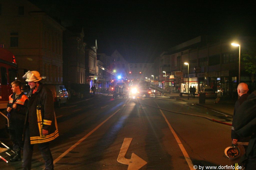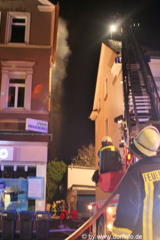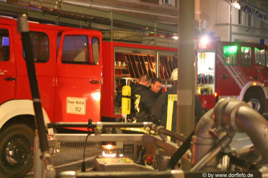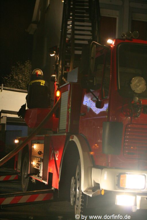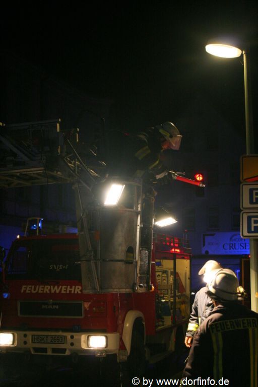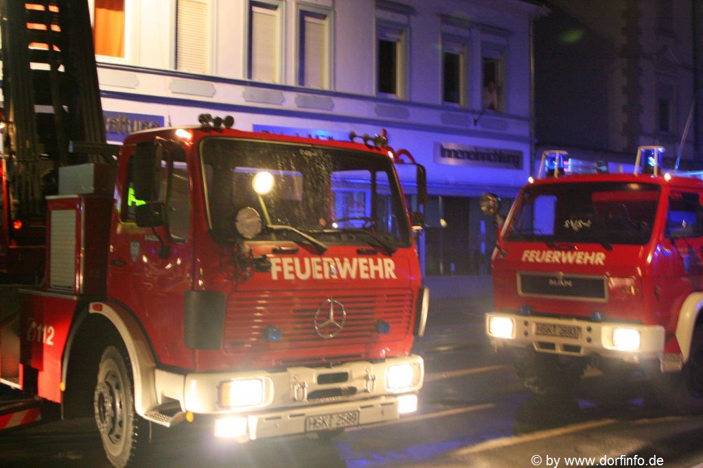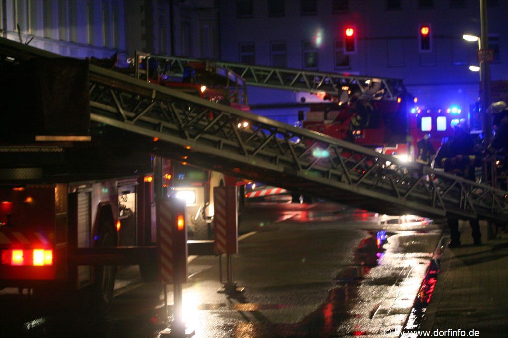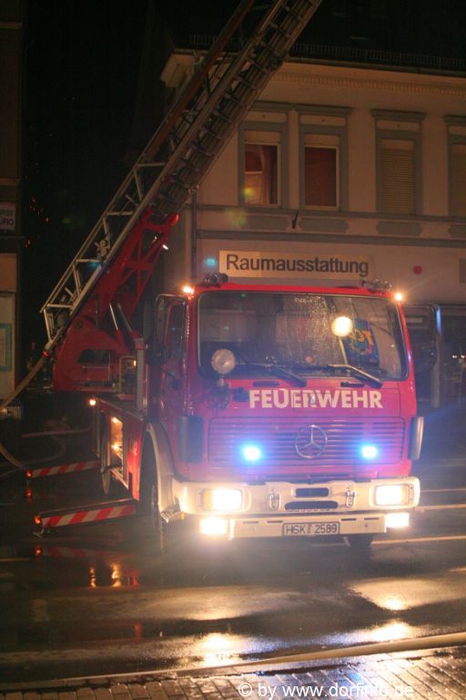 Auf der Dachterrasse eines Wohn- und Geschäftshauses in der Arnsberger Clemens-August-Straße ist am Montag um kurz vor 4 Uhr ein Brand ausgebrochen, der drohte, auf die angrenzende Wohnung und den Dachstuhl des Gebäudes überzugreifen. Durch das schnelle und routinierte Eingreifen der alarmierten Feuerwehr-Einsatzkräfte der Stadtteileinheit Arnsberg sowie des Stützpunkttrupps der Wache Neheim unter der Leitung von Brandamtsrat Peter Glaremin konnte jedoch ein direktes Übergreifen der Flammen auf das Gebäude verhindert und die Bewohner des Hauses dadurch vor einem größeren Schaden bewahrt werden. Gleichwohl wurde die Fassade der angrenzenden Wohnung durch den Brandrauch und die Wärmestrahlung beschädigt. Die 9 Hausbewohner hatten sich glücklicherweise bereits vor dem Eintreffen der Feuerwehr in Sicherheit bringen können. Eine Familie mit 3 kleinen Kindern, die in der betroffenen Dachgeschosswohnung lebt, wurde vorübergehend in einer städtischen Wohnung untergebracht. Die mit 11 Fahrzeugen und 50 Einsatzkräften angerückte Feuerwehr ging sowohl mit mehreren Trupps unter Atemschutz im Innenangriff als auch über 2 Drehleitern im Außenangriff gegen das Feuer vor und hatte es schnell unter Kontrolle. Es war dies der erste Einsatz der neuen Feuerwehr-Ärztin Marion Wiegelmann. Die Kripo hat die Ermittlungen zur Brandursache und Schadenshöhe aufgenommen. Vielen Dank an www.dorfinfo.de für die zu Verfügung gestellten Bilder