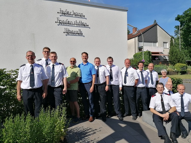 Der Löschzug Herdringen feiert pandemiebedingt verspätet die Einweihung der neuen Fahrzeughalle. Historischer Friedensspruch findet neuen Platz.