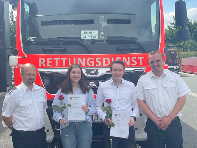 Ende Juni 2022 konnten die beiden Auszubildenden Lina Tüffers und Tobias Heckmann erfolgreich die Prüfung zur Notfallsanitäterin / zum Notfallsanitäter absolvieren. Sie unterstützen nun tatkräftig den Rettungsdienst der Feuerwehr der Stadt Arnsberg.
