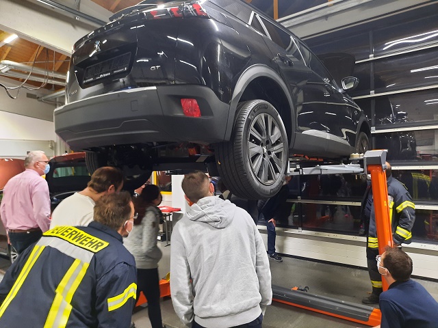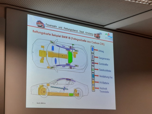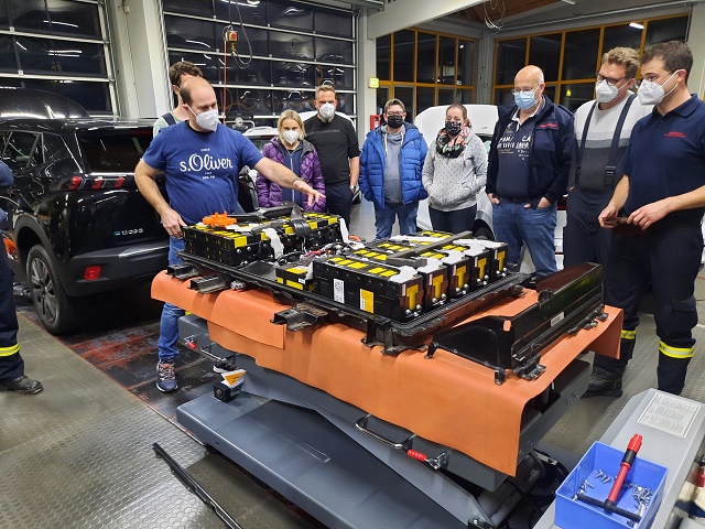 Folgende Ausbildungsinhalte wurden erläutert: Technik und Funktionsweise von eCall an Fahrzeugen und die Verwendung von Rettungskarten, die fahrzeugtypspezifische Information zu verschiedenen Elektrofahrzeugen bei einem Verkehrsunfall beinhalten. An verschiedenen Elektrofahrzeugen wurde gezeigt, wo die orangenen HV-Leitungen in den Autos verbaut sind und wie bei einer Beschädigung damit umzugehen ist. Wichtig war die Information, dass man jederzeit eine qualifizierte Elektrofachkraft über die Leitstelle nachfordern kann. Des Weiteren konnte an diesem Abend eine geöffnete Hochvolt-Batterie im Detail besichtigt werden.
