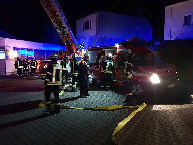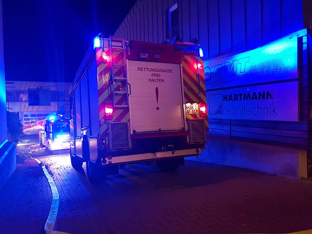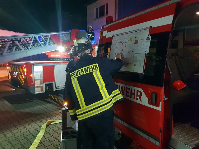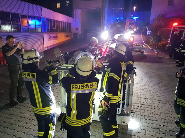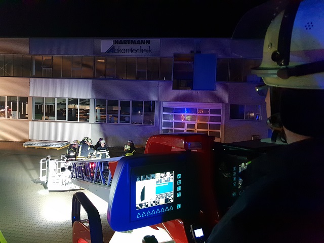 Schon auf der Anfahrt zur Einsatzstelle ist der Qualm weithin sichtbar, der Einsatzleiter teilt umgehend seine Kräfte in Abschnitte ein; vorrangiges Ziel ist die Rettung der vermissten Mitarbeiter. Ein Angriffstrupps unter schwerem Atemschutz macht sich auf den Weg in das betroffene Objekt, um schnellstens die bedrohten Personen zu retten. Parallel dazu wird eine Löschwasserversorgung aufgebaut und im vorderen Bereich der Halle die Drehleiter in Anleiterbereitschaft positioniert. Wenig später fand ein Trupp im ersten Obergeschoss eine Person, wegen der schweren Verletzungen wurde der Mann mit dem Korb der Drehleiter nach unten gebracht und dem Rettungsdienst übergeben. Auf der anderen Seite des großräumigen Gebäudekomplexes wurden zwei weitere Personen mit einer Wärmebildkamera lokalisiert und von den Einsatzkräften ins Freie gebracht. Die Wehrleute konzentrierten sich danach auf die Brandbekämpfung, das Gebäude wurde gelüftet und das Feuer war schnell unter Kontrolle. Neheims Löschzugführer Tobias Jakob dankte seinen Kameraden bei der Nachbesprechung für die hervorragende Teamarbeit. Firmeninhaber Werner Hartmann war begeistert von den vielen Kräften der Feuerwehr – und das an einem Freitagabend. Bei einem Imbiss dankten sowohl die Geschäftsleitung als auch die Löschzugführung den Neheimer Feuerwehrleuten für ihr Engagement.