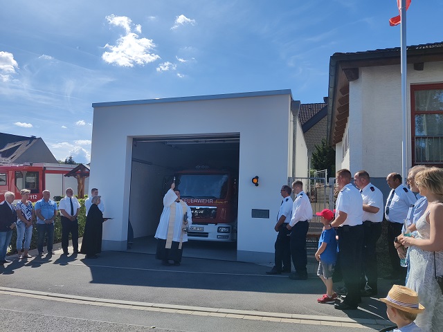 Nach der Begrüßung des leitenden Löschzugführers Michael Wenzel, wurde eine Urkunde der Einweihung, Münzgeld, sowie eine Tageszeitung in einer Zeitkapsel hinter dem Jahresstein der neuen Fahrzeughalle eingemauert. Die Segnung und Einweihung übernahmen ab hier Pfarrer Daniel Maiworm und Pfarrerin Ulrike Rüter. Nach einer kurzen Andacht weihten die beiden geistlichen von katholischer und evangelischer Kirche die neue Fahrzeughalle mit den Worten „Gott zur Ehr – dem nächsten zur Wehr“ ein.