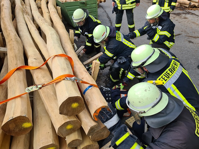 Nach ersten Erkundungen durch den Einsatzleiter Sebastian Mattern bestätigte sich die Lage. Zusätzlich ist auf dem Gelände ein Holzstapel umgefallen und hat einen Mitarbeiter eingeklemmt.