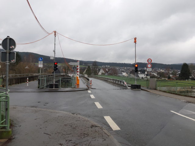 Die Dinscheder Brücke ist zurzeit für Fahrzeuge mit einem zulässigen Gesamtgewicht über 3,5 Tonnen in beide Fahrtrichtungen gesperrt. Seit einem Jahr wird darüber hinaus der Verkehr nur noch einspurig über die Brücke geführt. Jetzt muss zur Sicherstellung des Durchfahrverbotes für Lastkraftwagen die Breite weiter reduziert werden. Zu dieser aktuellen Entwicklung hatte die Straßen.NRW-Regionalniederlassung Sauerland-Hochstift zu einem Informationsaustausch eingeladen. Nach einer intensiven Diskussion wurde durch den Landesbetrieb eine Möglichkeit gefunden, Rettungsfahrzeuge im Einsatzfall, Betriebsdienstfahrzeuge und den Linienbusverkehr weiterhin zuzulassen, gleichzeitig aber die Benutzung durch andere Lastkraftwagen zu unterbinden.